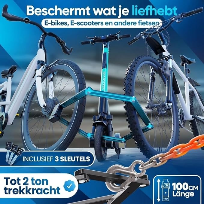 OVERAL GEMAKKELIJK PARKEREN – Met een ruime lengte van 100 cm heb je precies dat kleine extra ruimte die standaard sloten missen. Hierdoor kun je je tweewieler eenvoudig aan een lantaarnpaal, fietsenrek of hek bevestigen. Ideaal voor bredere frames en elektrische scooters.