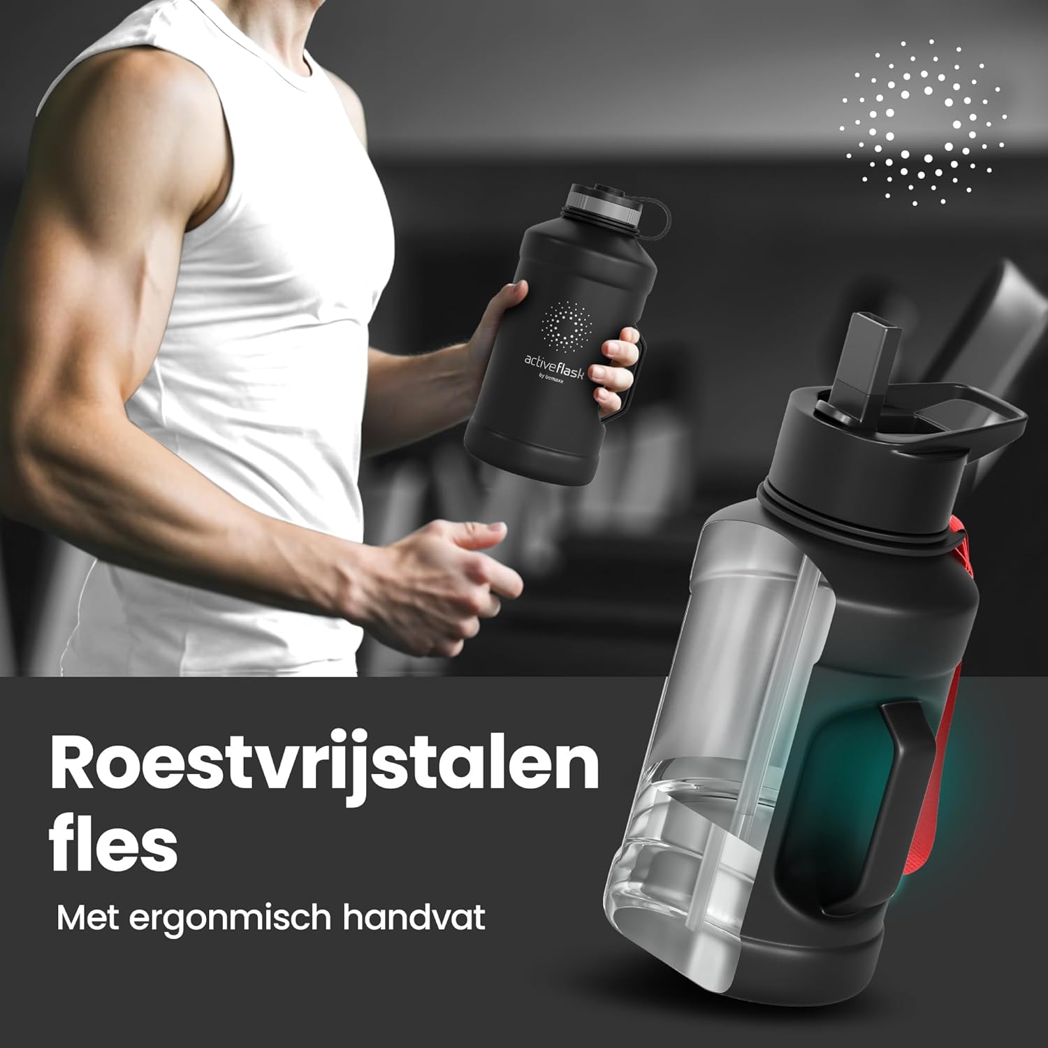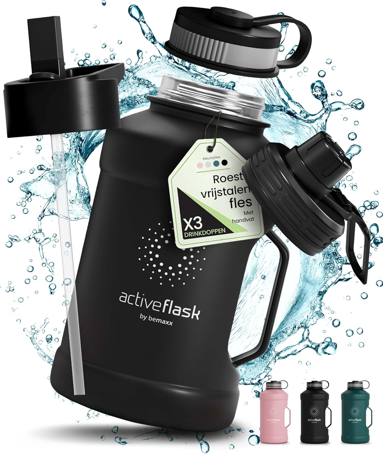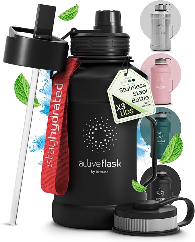Drinkfles RVS Thermosfles ACTIVE FLASK + Strohalm (3 Drinkdoppen), BPA-Vrij + Lekvrij | 1 Liter/500 ml Isoleerfles, Vacuüm Waterfles Sport Fitness Fietsen… Zwart