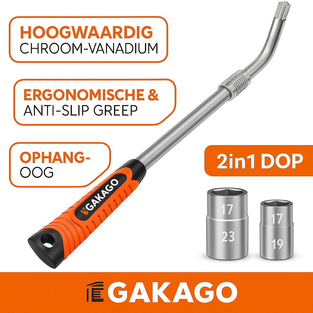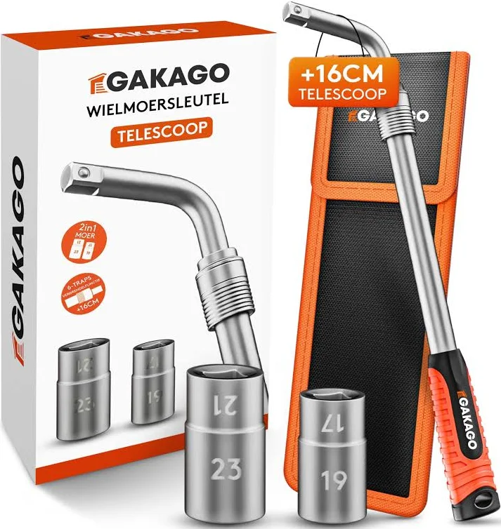 Telescopische wielmoersleutel van Gakago met 17/19 mm & 21/23 mm doppen. Gemaakt van sterk chroom-vanadium staal, uitschuifbaar tot +16 cm, met comfortabele antisliphandgreep en stevige opbergtas.