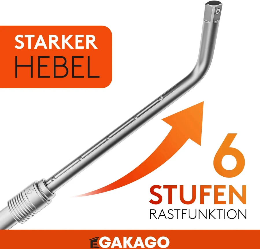 STERKE HEVEL – In vergelijking met vergelijkbare producten van concurrenten heeft de wielsleutel van Gakago een uitschuifbare 6-traps telescopische functie en daardoor een extra hefboom van 16 cm!
