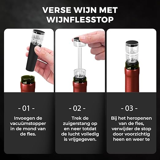 Met de vacuümpomp kun je je al geopende wijn nog langer maken en met de foliesnijder open je elke wijnfles als een professional. De stop zorgt voor een hygiënische sluiting van de wijnfles op tafel, terwijl de koeltas zorgt voor de noodzakelijke hygiëne in de vriezer.
