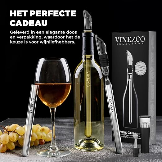 De VINENCO 3-in-1 wijnkoeler met druppelvrije gieter en beluchtingsfunctie houdt uw voorgekoelde wijn op optimale drinktemperatuur en verfrist de rode wijn tot de ideale keldertemperatuur. Ontvang je BONUS FOLIESNIJDER, STOP, OPSLAGZAK EN EBOOK OVER WIJNPROEVERIJ VIA DOWNLOAD BIJ ELKE BESTELLING.